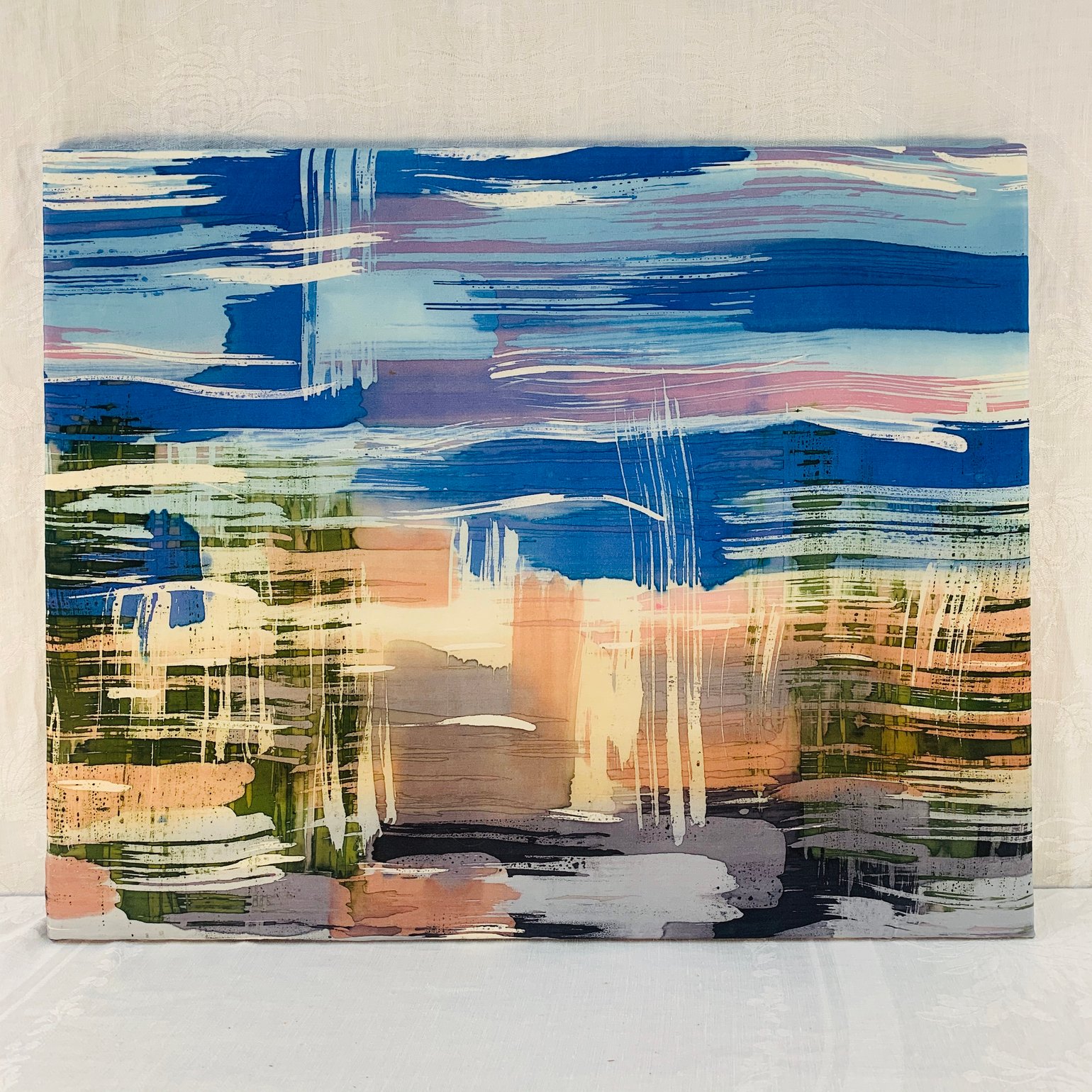 16x20 inches gallery wrapped 3/4 inch deep canvas, unframed. Batik process. Porch pick-up or contact for shipping